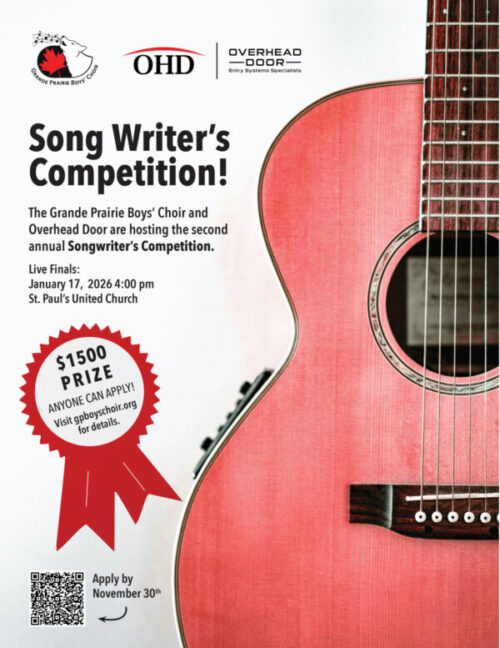 We are proud to announce the second annual Grande Prairie Boys’ Choir Songwriters’ Competition, a platform celebrating songwriting talent from across the Peace Region.